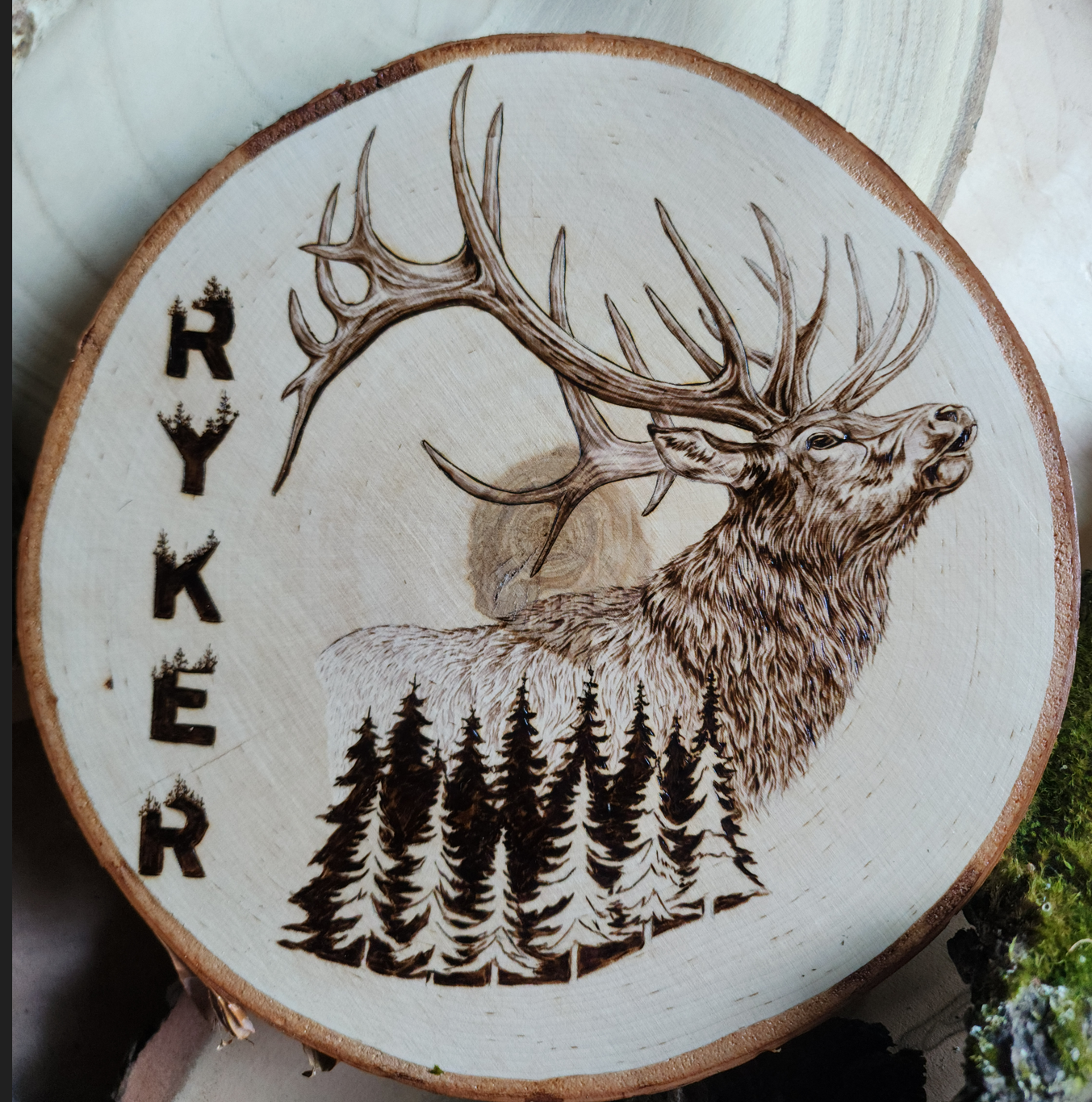 “Ryker” is a tribute to the wild — strong, alert, and rooted in the rugged beauty of the backcountry. The bull elk stands poised with a proud, sky-reaching rack, every burn mark layered to capture the depth of fur, the power in his stance, and the instinctive call to the mountains. Below him rises a forest silhouette, grounding the scene in the deep timberland he calls home.