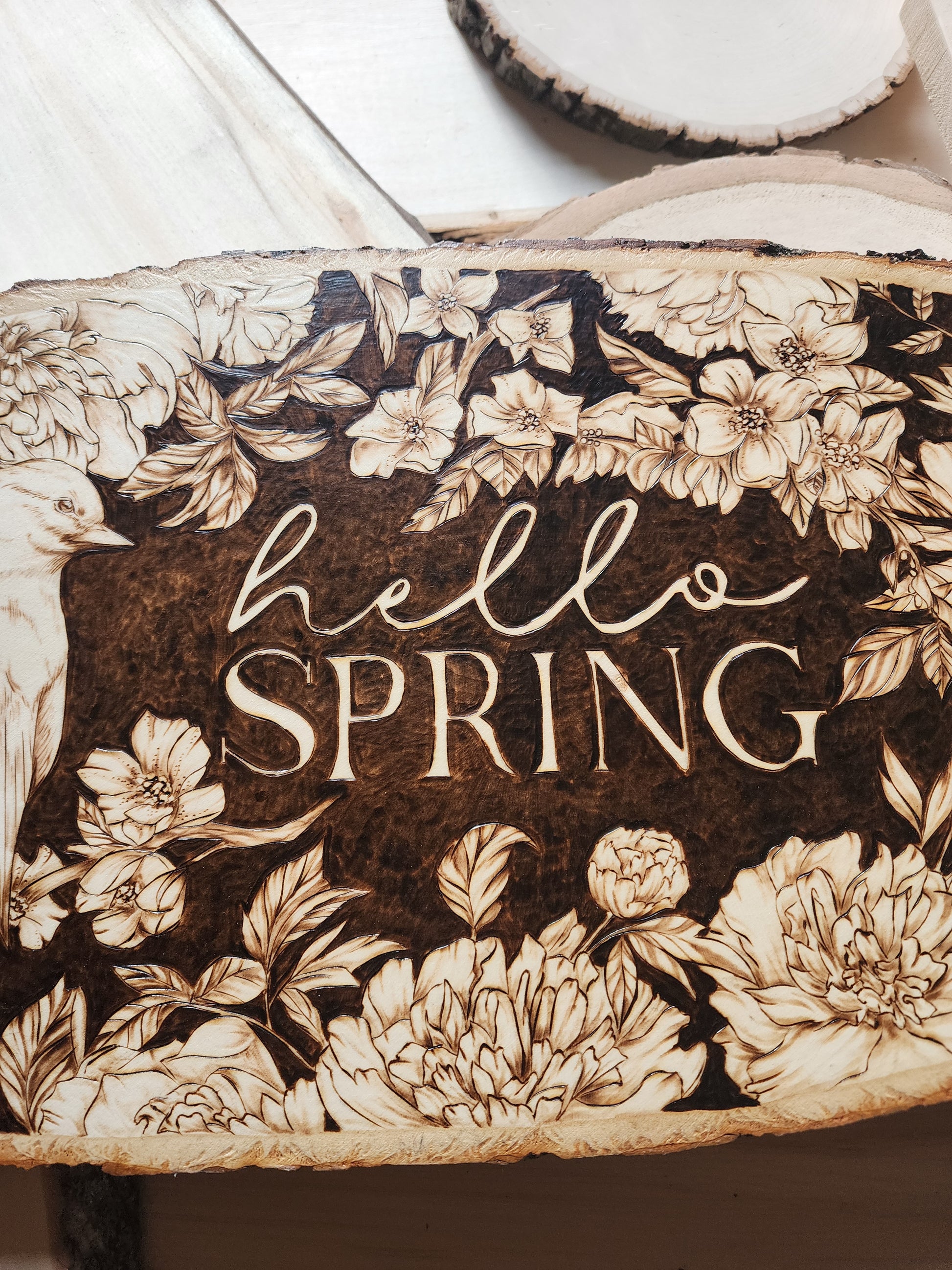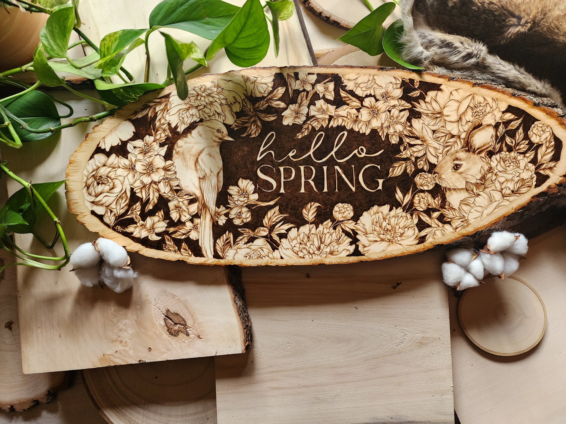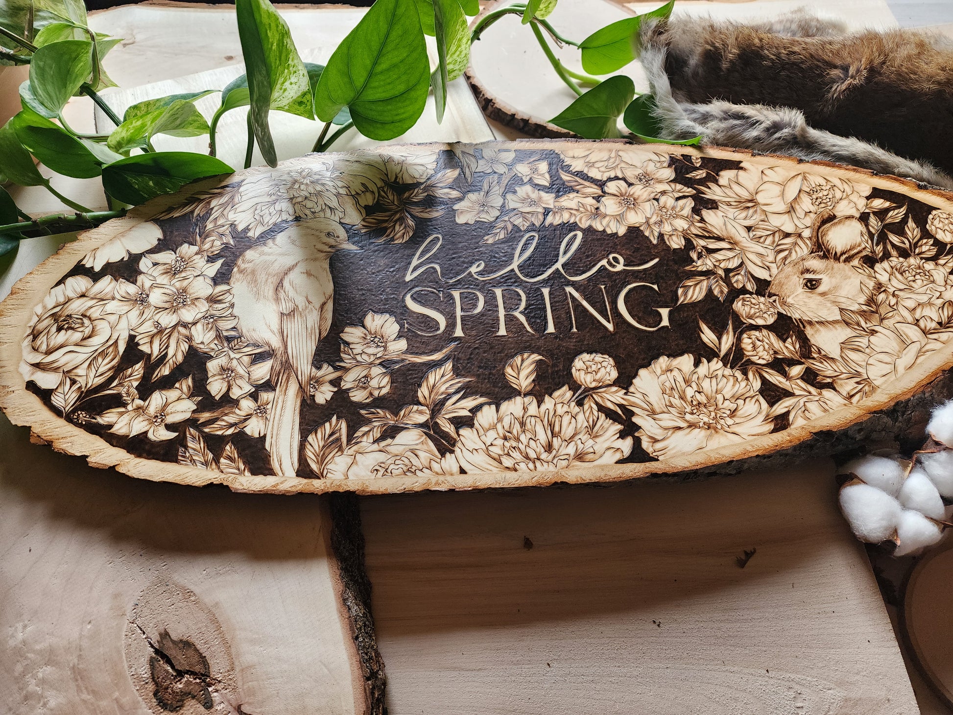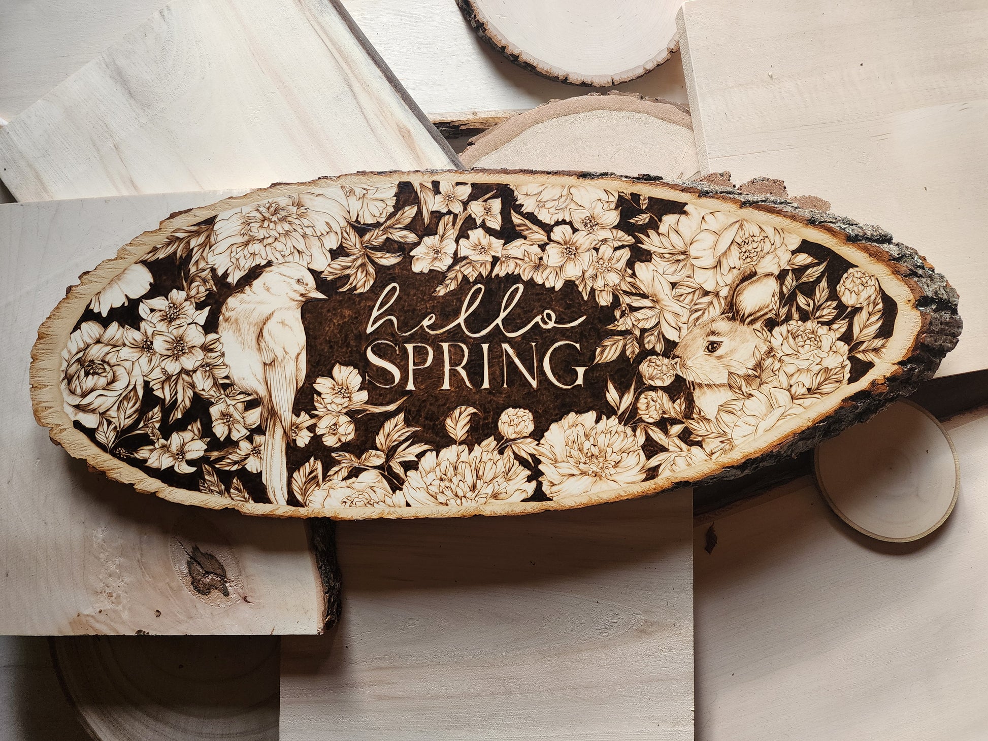 Celebrate the season with this hand-burned original artwork capturing the essence of spring. A delicate bird perches gracefully on a cherry blossom branch, surrounded by blooming flowers and a playful bunny nestled among the petals. Set against a rich dark background, the piece features "Hello Spring" lettering that draws the eye and anchors the composition. Each detail is carefully burned by hand, creating depth and warmth in this one-of-a-kind seasonal design. Perfect for bringing nature's renewal into your home.