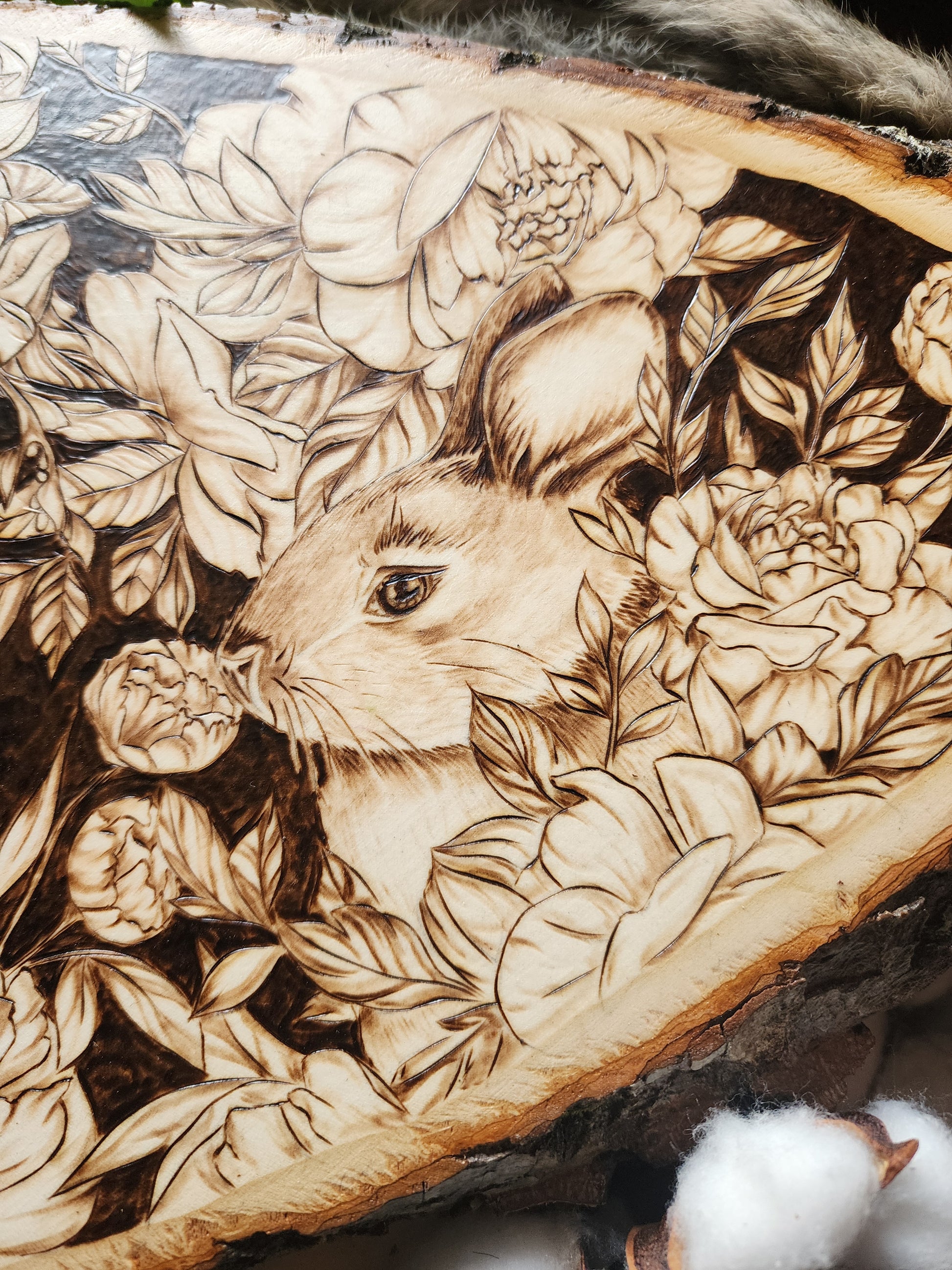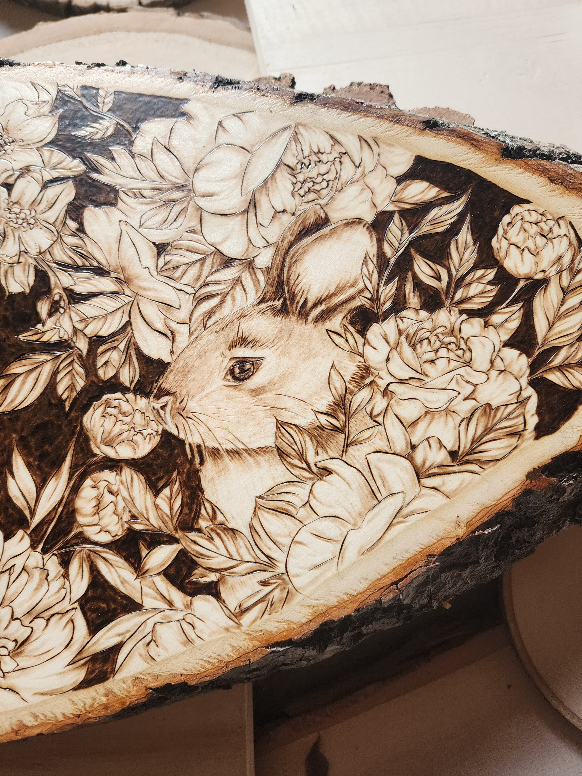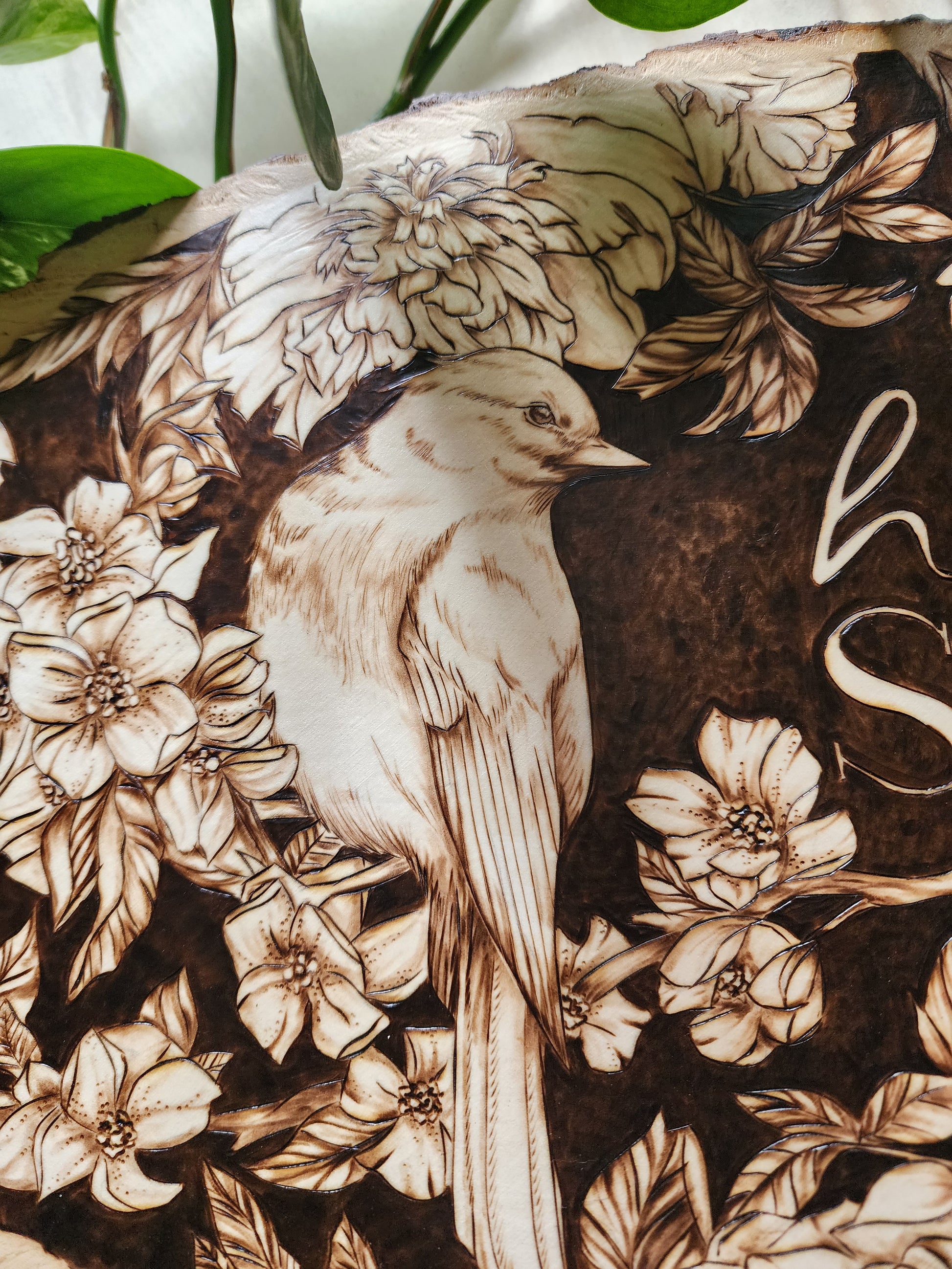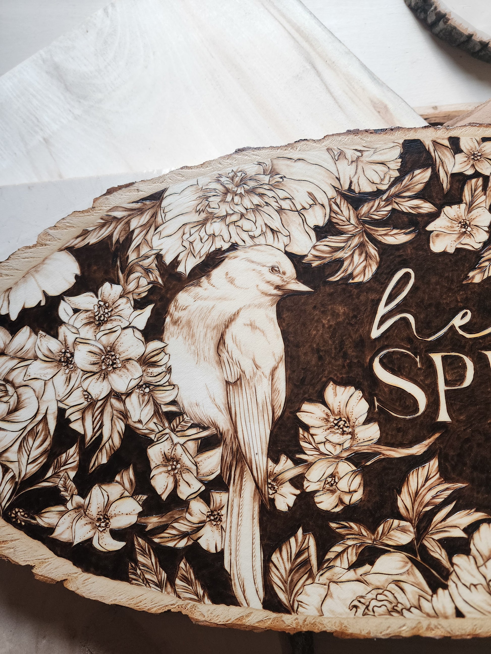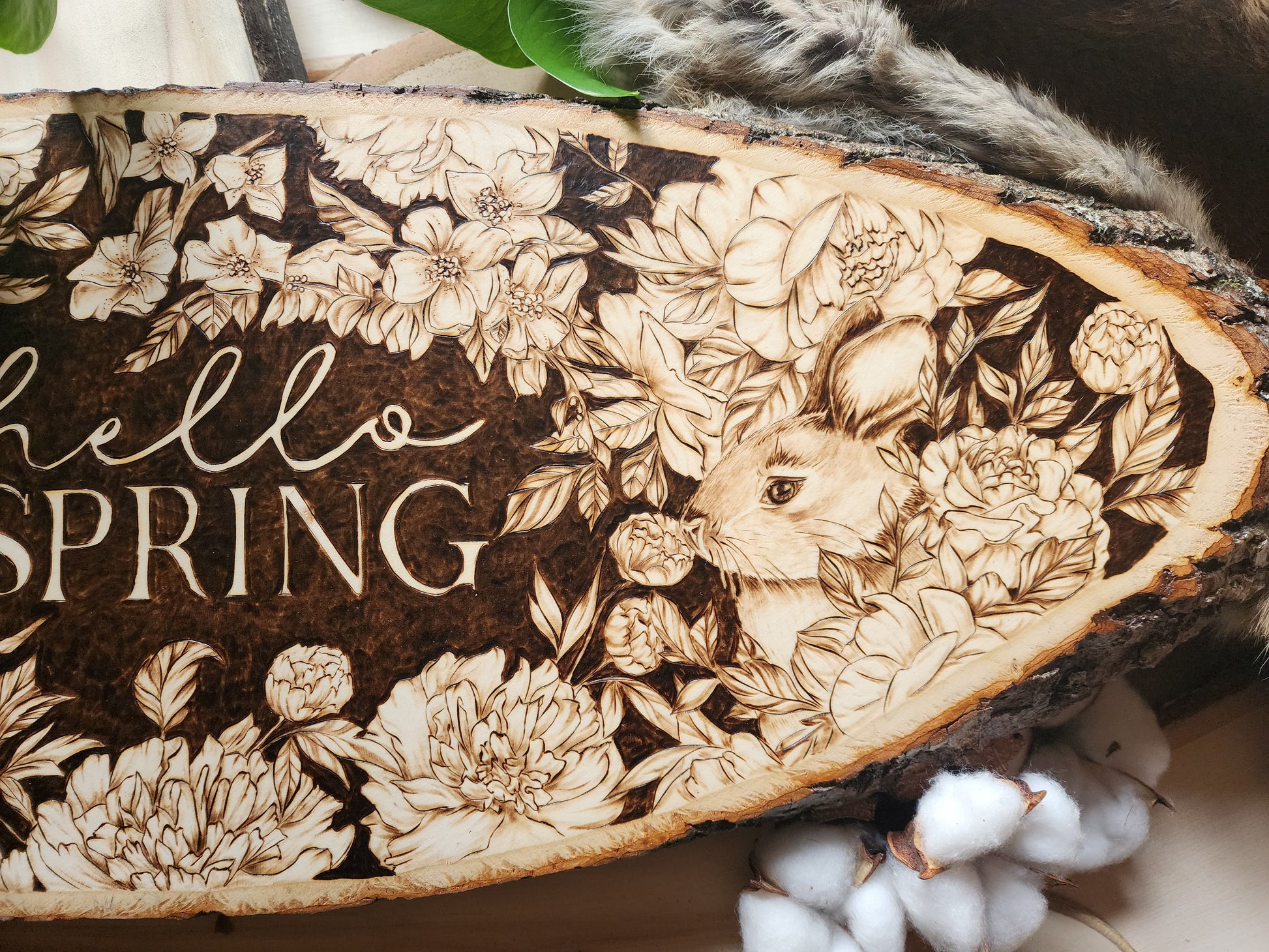 Celebrate the season with this hand-burned original artwork capturing the essence of spring. A delicate bird perches gracefully on a cherry blossom branch, surrounded by blooming flowers and a playful bunny nestled among the petals. Set against a rich dark background, the piece features "Hello Spring" lettering that draws the eye and anchors the composition. Each detail is carefully burned by hand, creating depth and warmth in this one-of-a-kind seasonal design. Perfect for bringing nature's renewal into your home.